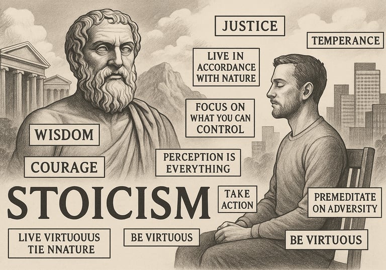 Lai izprastu šīs filozofijas saknes, jāatgriežas Atenās, 3. gadsimtā pirms musu ēras. ledomājies tirgus laukumu, kur soļo cilvēki, un tur - Zenons, kas iedēsta sēklu, no kuras uzaug koks, kura zari stiepjas līdz mūsdienām. No šīs sēklas dzima māciba, kas nebija tikai vārdi uz pergamenta, bet dzīves ceļvedis. Seneka, Epiktēts un Marks Aurēlijs šo koku pārvērta par svētnīcu. Viņus klausijās valdnieki un karotāji, jo stoicisms bija nevis mīksts mierinājums, bet tērauda bruņas dvēselei.
